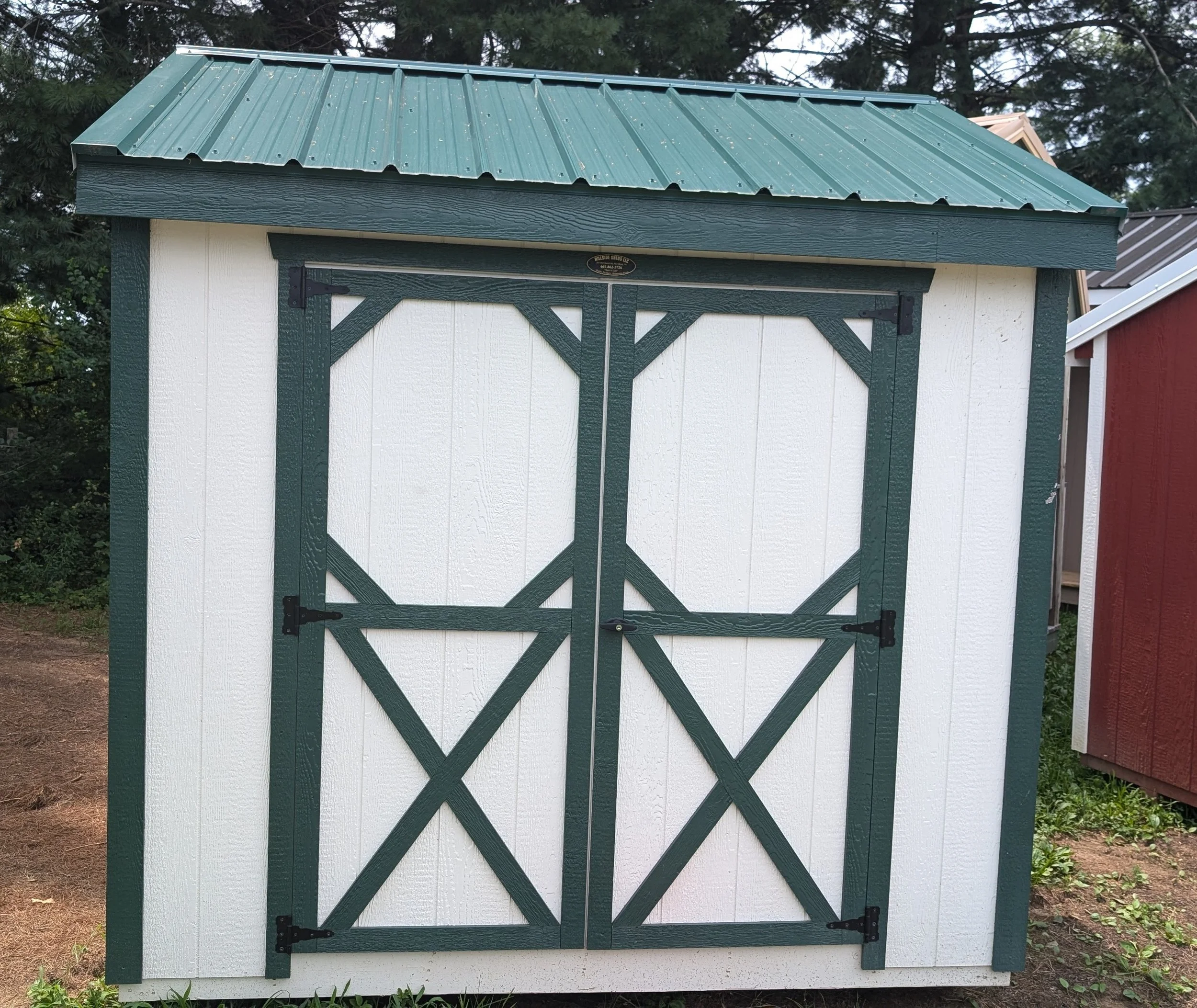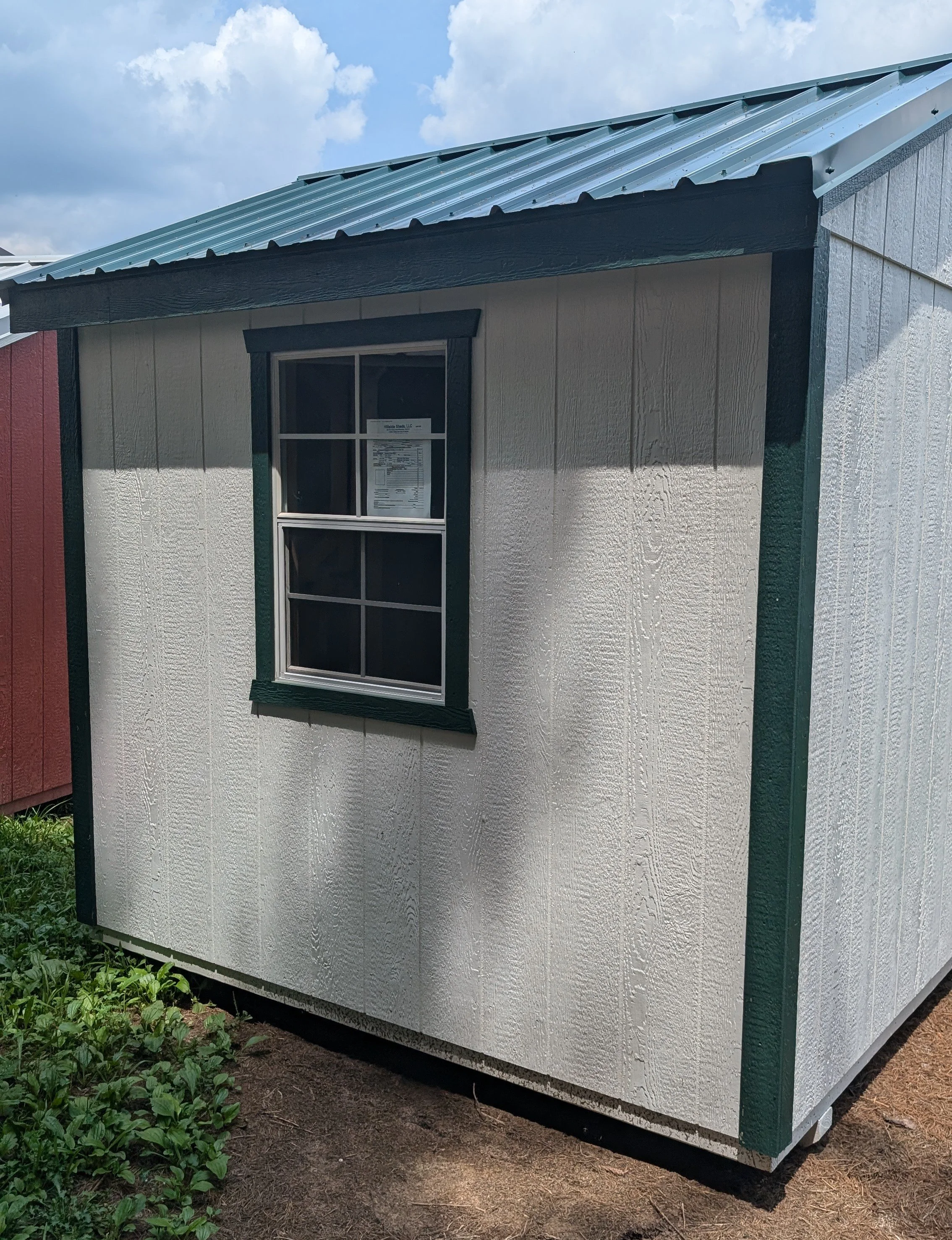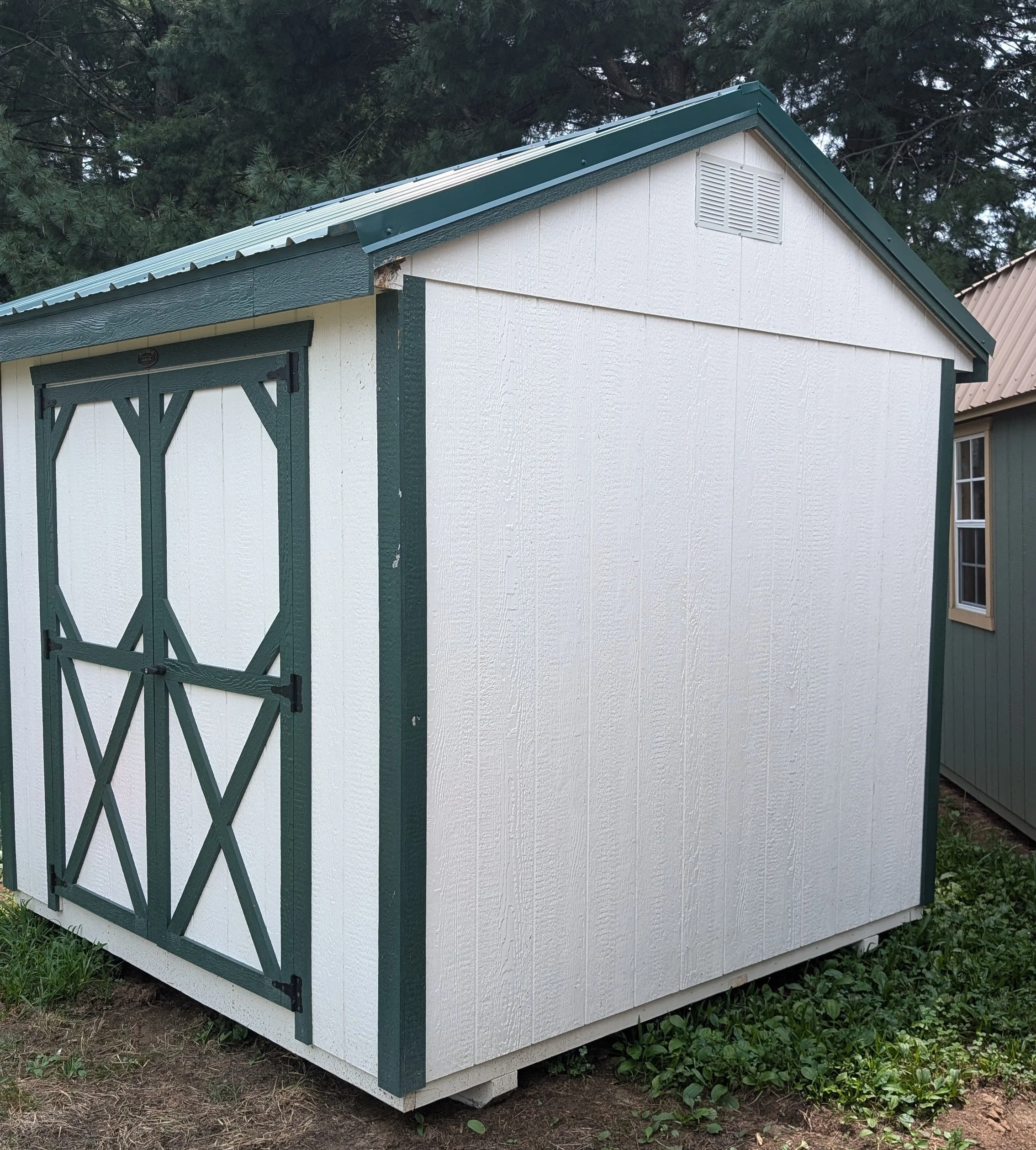 This 10x12 A-Frame Shed is built for both practicality and aesthetics, featuring Leola Almond siding paired with a Patina Green metal roof for a classic yet modern look. Designed for durability and efficient storage, this shed is perfect for any backyard or workspace.